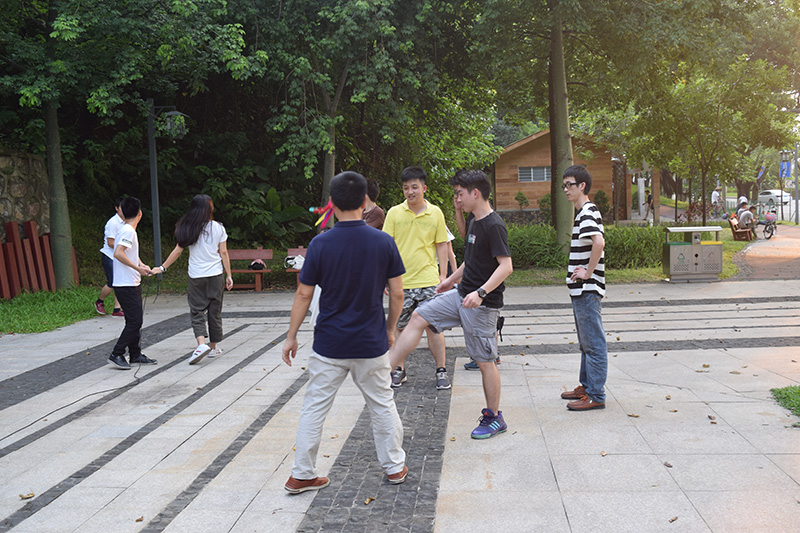游戲關是由位位隊員開始踢滿5個然后交由下一位隊友,依次類推,快全部成員踢滿毽子數的隊伍——藍隊獲得這輪勝利并獲得精美禮品一份。這一關主要考驗我們反應速度和體力。