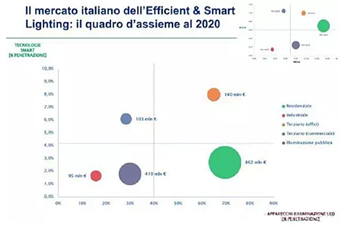 ? 首先,我們可以看到,意大利當前的市場狀況(如下“圖一”所示)。商店(第三方市場)的特點是LED的滲透力小,智能照明方案的滲透力高。在辦公室,LED與智能照明方案都很受歡迎。但在工業(yè)方面,這兩者的增長速度卻非常緩慢。其中,占據(jù)大份額的是住宅部分,主要原因是LED燈在家用方面的快速擴增。然后,再來看2020年的意大利照明市場預測情況(如下“圖二”所示)。據(jù)悉,意大利家用照明的LED產(chǎn)品數(shù)量將會達到4億。與2015年相比,工業(yè)的照明市場將增長80%,LED產(chǎn)品在意大利制造廠中的的安裝比率將占20%。在公共照明方面,2020年LED路燈的數(shù)量將達到350萬,每年可節(jié)約1TWh的電(占總用電的5%)。